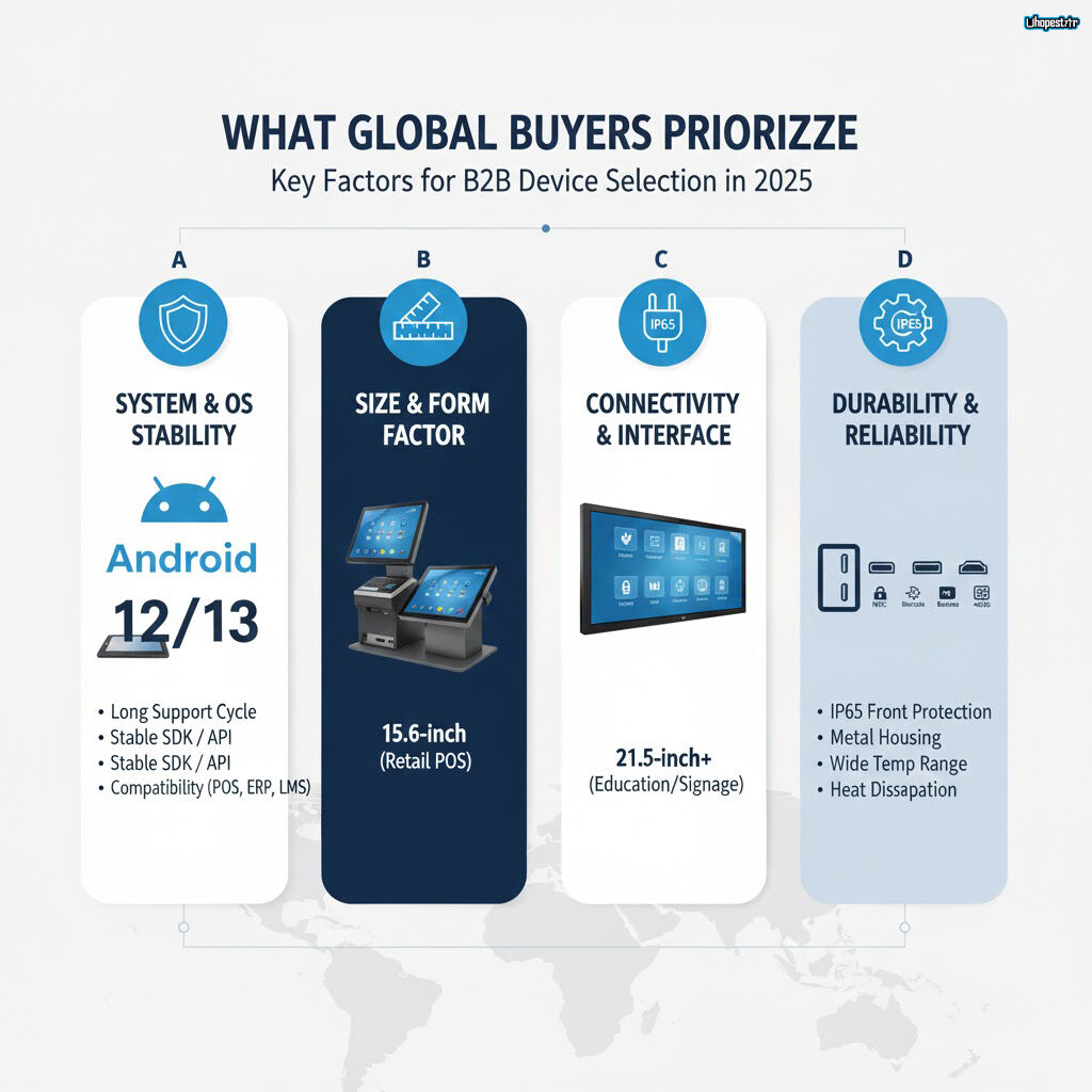 Οι διεθνείς αγοραστές προτιμούν όλο και περισσότερο Android 12/13 πλατφόρμες με μακροχρόνια υποστήριξη. Η σταθερότητα, οι ενημερώσεις ασφαλείας και η συμβατότητα με επιχειρησιακές εφαρμογές είναι πλέον βασικοί παράγοντες απόφασης.