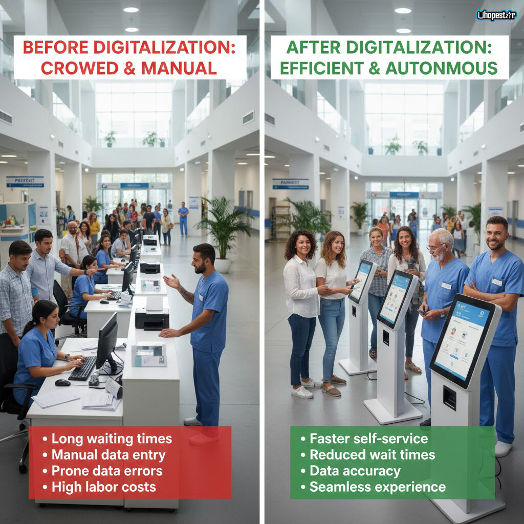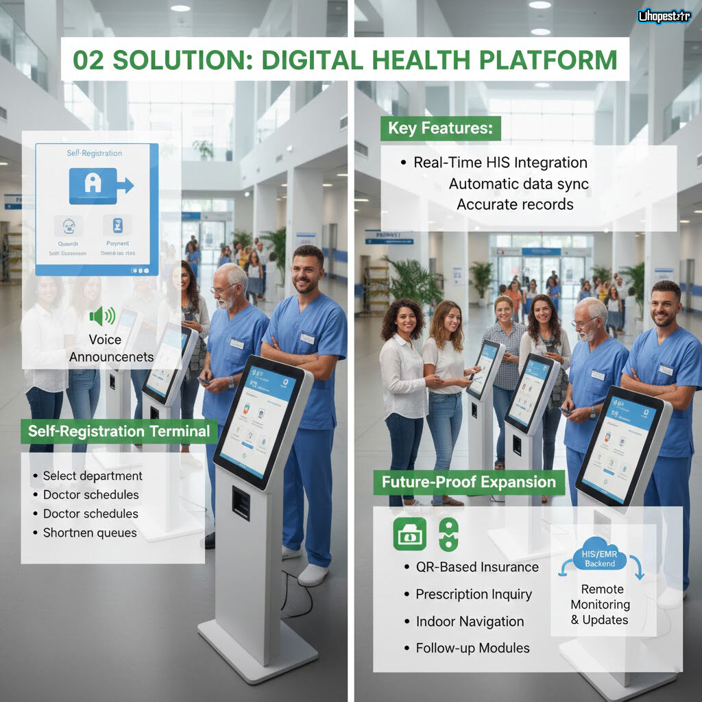 Pada masa yang sama, sistem penjagaan kesihatan kebangsaan sedang mendorong perkhidmatan hospital yang lebih pintar dan terintegrasi. Selepas meningkatkan platform HIS, LIS, dan EMR, banyak institusi perubatan ingin melanjutkan digitalisasi kepada pihak pesakit. Matlamat mereka adalah membolehkan pesakit menyelesaikan tugas asas—seperti pendaftaran, pembayaran, dan pertanyaan barisan—dengan cepat dan sendiri, mencipta pengalaman lawatan yang lancar dan cekap sejak mereka memasuki hospital.